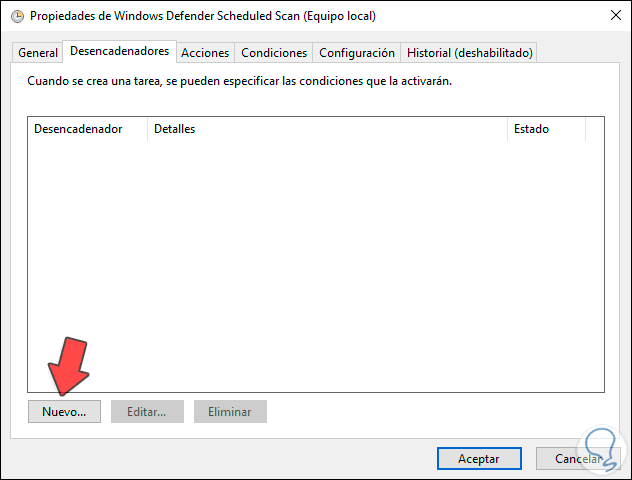 Ahora vamos a la pestaña “Desencadenadores” y en la parte inferior damos clic en “Nuevo”: