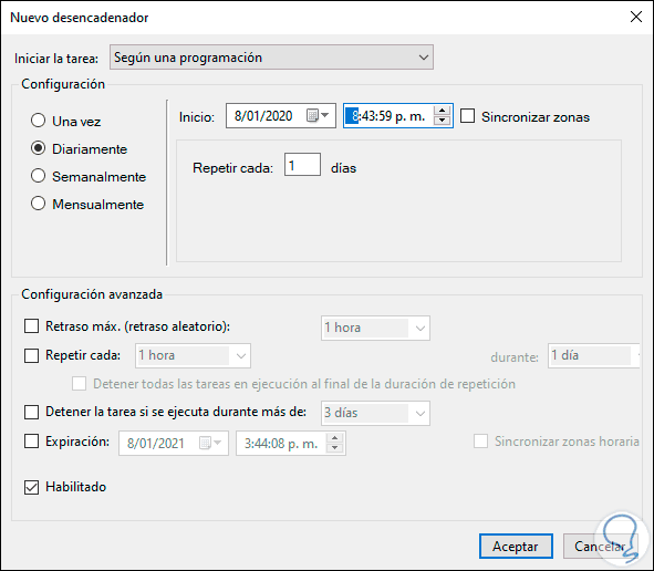 Una vez definido esto damos clic en Aceptar para configurar los cambios. Ahora reiniciamos el equipo y así, Windows Defender solo trabajará según la programación que hemos definido.