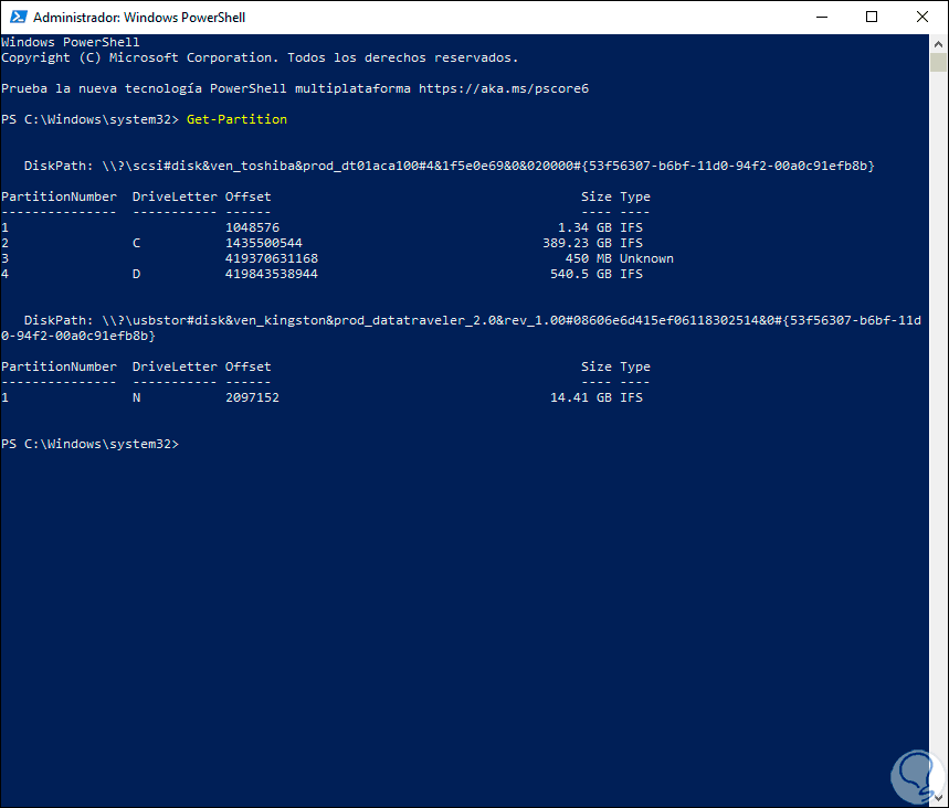 Podemos ejecutar de nuevo Get-Partition para validar el cambio: