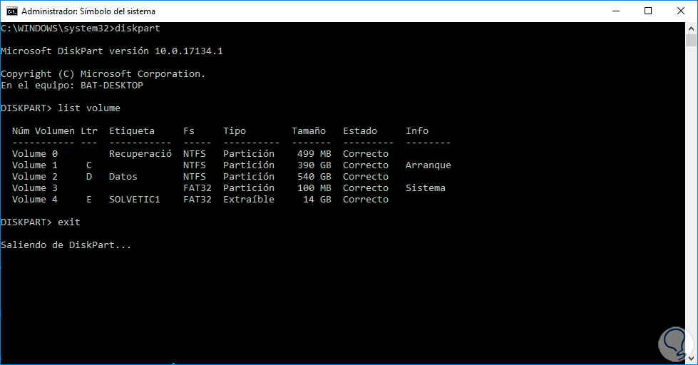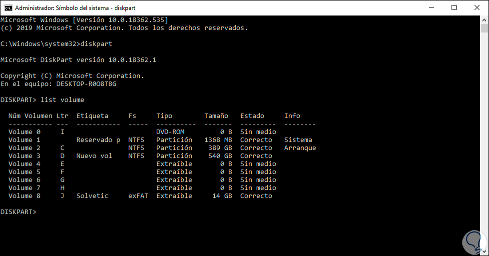 Para ello accedemos como administradores y ejecutamos el comando “diskpart”, luego listamos las unidades con el comando “list volume”: