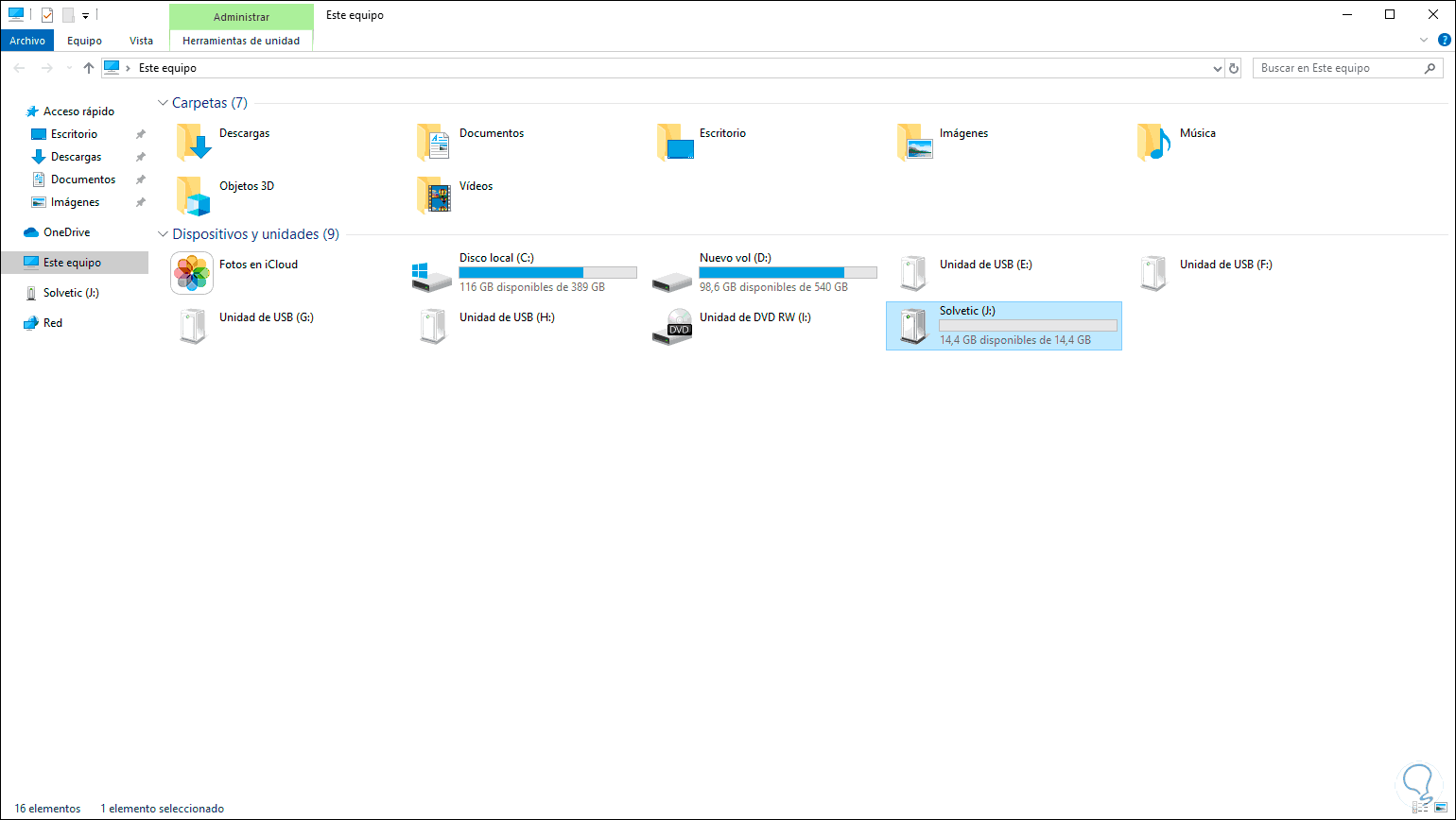 Nuestras unidades nos ayudan a poder organizar el contenido en diferentes lugares ya sean internar o externas. Desde cada unidad podremos gestionar diferentes aspectos en función de para qué hayamos dedicado esa unidad de almacenamiento. Dentro de la terminal de comandos podremos movernos entre cada unidad para poder configurar o realizar cambios que necesitemos en un momento dado obviando el modo gráfico. Microsoft ha integrado diversas opciones de personalización y administración de Windows 10 y una de ellas es la asignación automática de letras a las unidades de almacenamiento conectadas tanto internas como externas, esto lo podemos validar desde el Explorador de archivos del sistema: