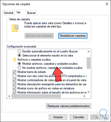 En la ventana emergente iremos a la pestaña “Ver” y allí activamos en primer lugar la casilla “Mostrar archivos, carpeta y unidades ocultos”: