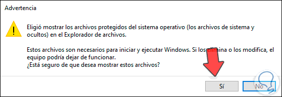 Luego iremos un poco hacia abajo y desactivamos la casilla “Ocultar archivos protegidos del sistema operativo” y al dar clic sobre ella se lanzará la siguiente advertencia: