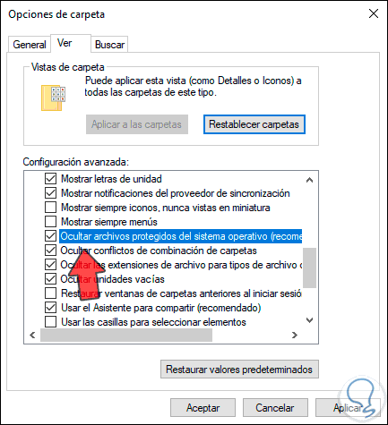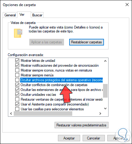 Luego activamos la casilla “Ocultar archivos protegidos del sistema operativo”: