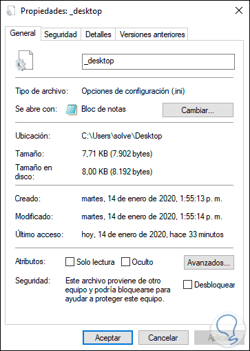 Podemos dar clic derecho sobre este archivo “desktop.ini” y seleccionar Propiedades para ver su tipo de comportamiento el cual es “Opciones de configuración”: