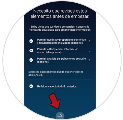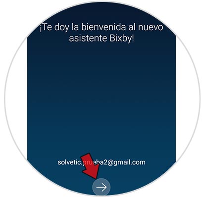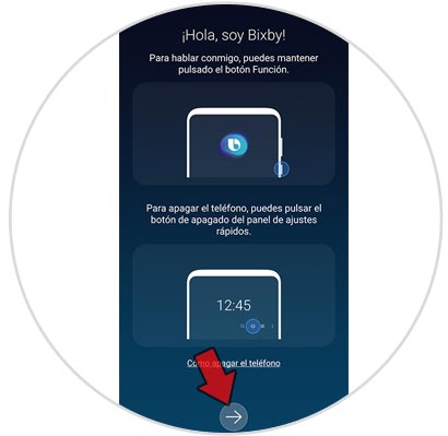 A continuación verás que aparece una pantalla en la que pone "Hola, soy Bixby". Debes seleccionar la flecha inferior para continuar.