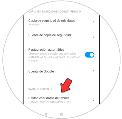 Debes desplazaría hasta el final de este pantalla, para encontrar el apartado “Restablecer datos de fábrica”. Pulsa sobre esto para continuar.