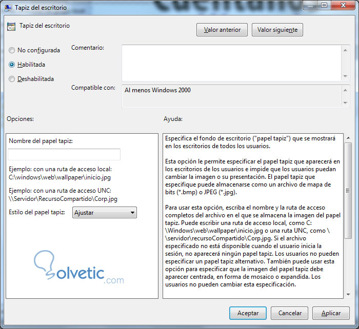 - La abrimos y la habilitamos, Luego debemos colocar la ruta calificada donde se encuentra la imagen que deseamos fijar como fondo de pantalla, puede ser una ruta local como por ejemplo C:\Windows\web\wallpaper\home.jpg o ruta de red \\equiporemoto\fondos\escritorio_empresa.JPG