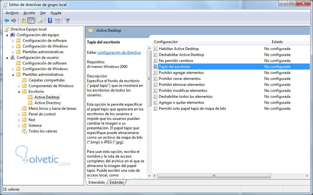 - Luego una vez que abra el editor vamos a localizar la siguiente ruta Directiva Equipo Local (Local Computer policy) > Configuración de Usuario (User Configuration) > Plantillas Administrativas (Administrative Templates) > Escritorio (Desktop), Active Desktop esto en el árbol que nos aparece en el panel del lado izquierdo.