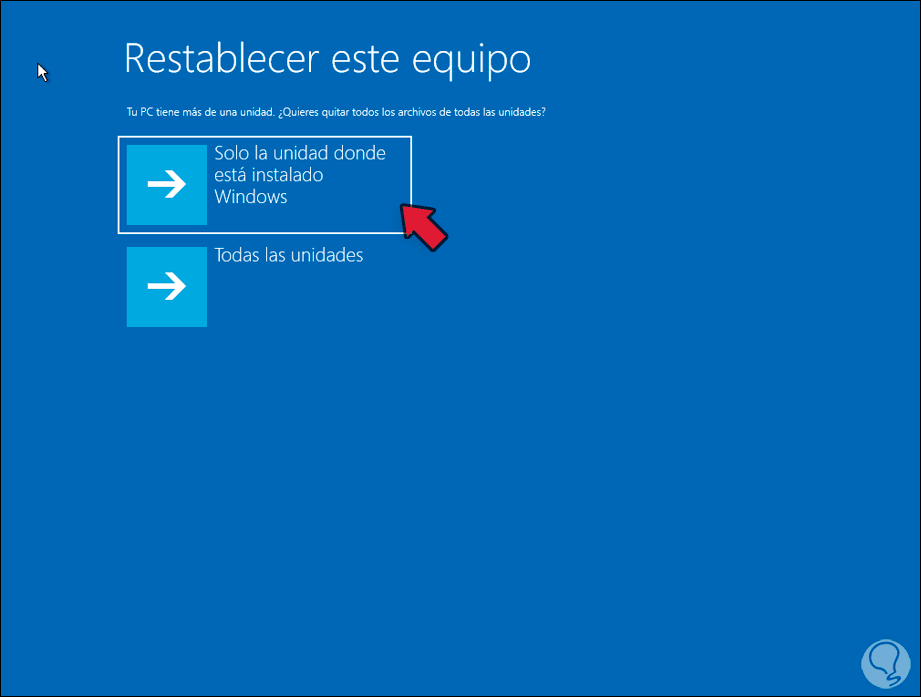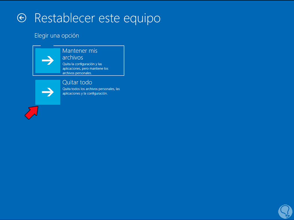Damos clic sobre la opción “Restablecer este equipo” y será desplegado lo siguiente.