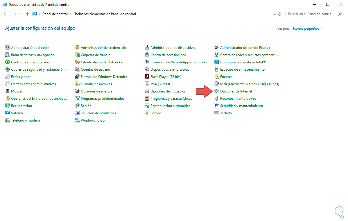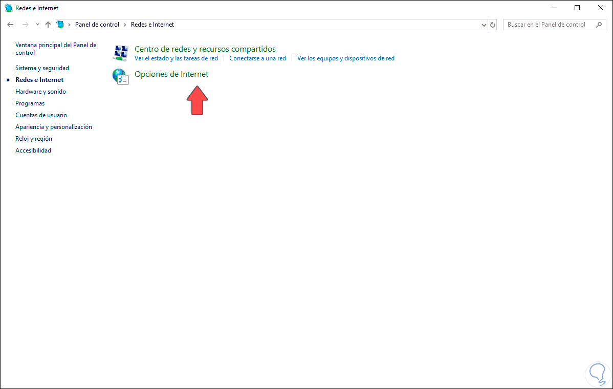 2. Abrir Opciones de Internet desde el Panel de control en Windows 10