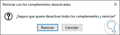 En el listado desplegado seleccionamos la opción “Reiniciar con los complementos desactivados” y se lanzará la siguiente advertencia: