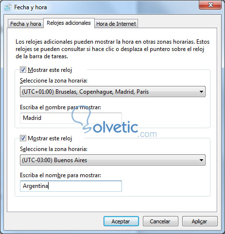 - Una vez en esta pantalla podemos agregar hasta dos relojes adicionales, lo que nos daría un total de 3 relojes en nuestro sistema.