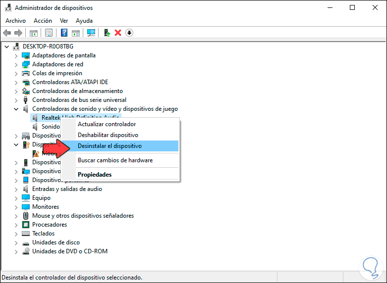 Allí iremos a la sección “Controladoras de sonido y video y dispositivos de juego”, desplegamos los controladores allí instalados y damos clic sobre el controlador “Realtek High Definition Audio” y damos clic en la opción “Desinstalar el dispositivo”: