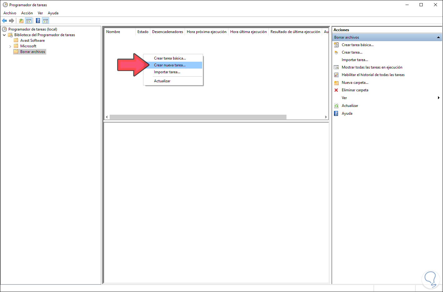 Para usar este método, accedemos al programador usando las teclas Windows + R y ejecutando el comando taskschd.msc. Una vez allí daremos clic derecho sobre “Biblioteca del programador de tareas” y seleccionamos la opción “Nueva carpeta”: