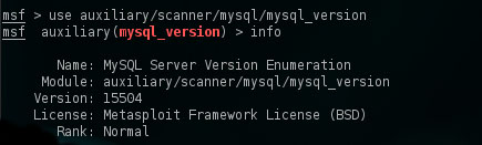 msf > auxiliary(mysql_version) >set RHOSTS 190.155.80.110 //seteamos la ip remota msf > set RHOSTS 192.155.80.110 msf > auxiliary(mysql_version) > run // consultar la versión mysql
