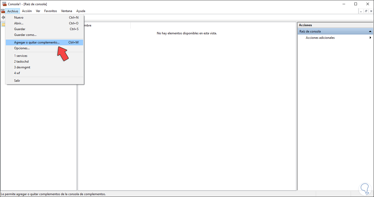 Pulsamos Enter o Aceptar y después de aceptar los permisos de UAC, iremos al menú “Archivo” y allí seleccionamos “Agregar o quitar complemento” o bien podemos usar las teclas siguientes: