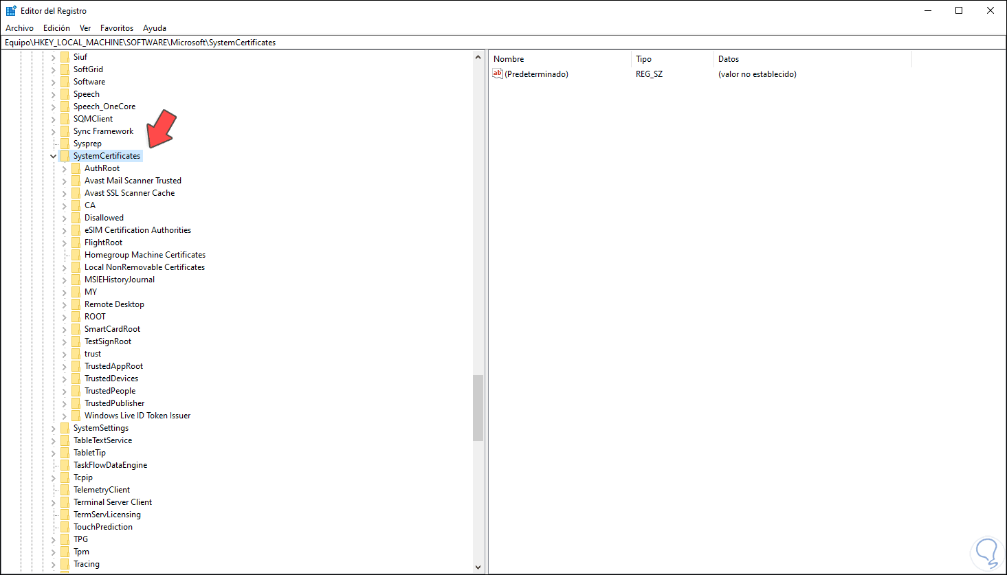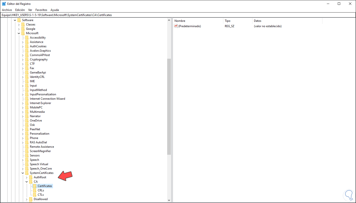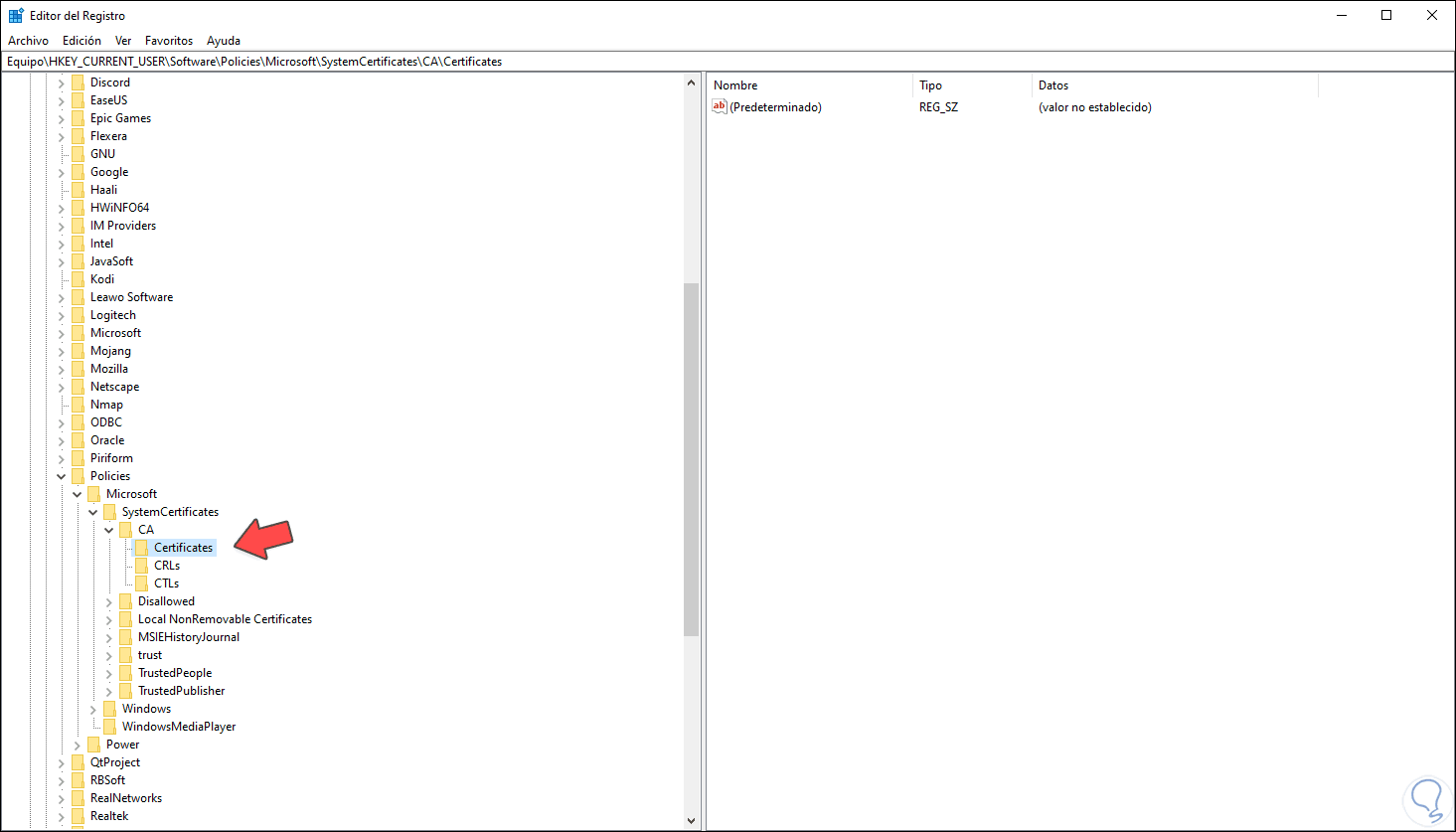 3. Ver los certificados digitales desde el Editor de Registro en Windows 10