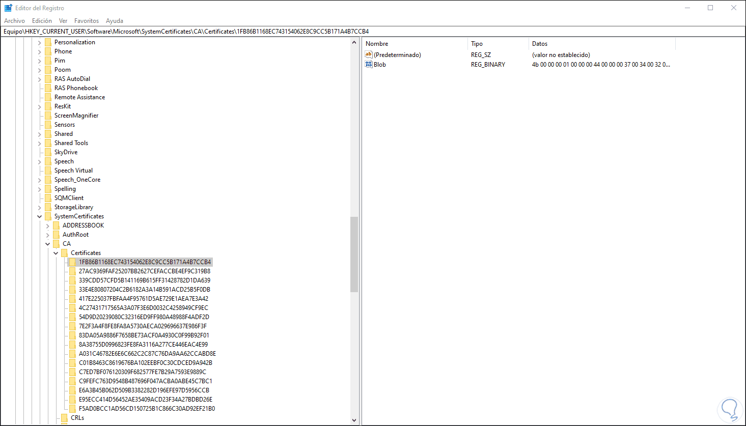 Por último, podemos acceder al editor de registros de Windows 10 para ver los diferentes certificados digitales disponibles.