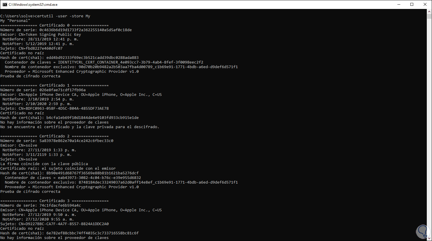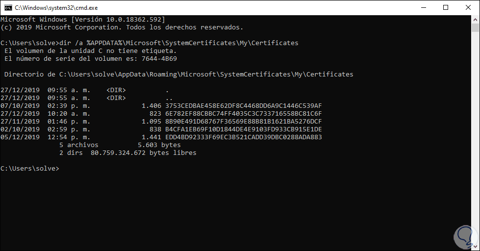 Desde el símbolo del sistema podemos ejecutar lo siguiente. Allí accedemos a un completo resumen de los certificados digitales de Windows 10.