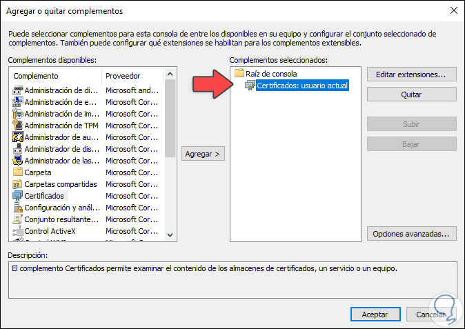 En la nueva ventana desplegada seleccionamos la opción “Certificados” y damos clic en el botón “Agregar”: