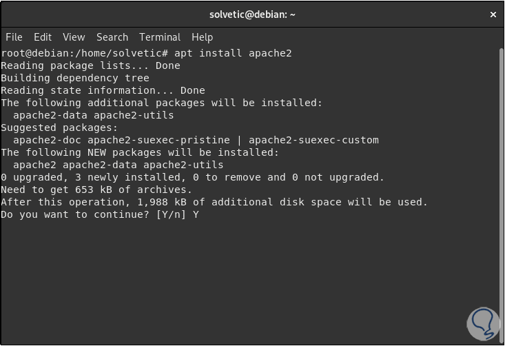 Ingresamos la letra Y para confirmar la descarga e instalación de Apache, luego de esto y se haya instalado Apache debemos ejecutar lo siguiente: