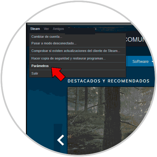Para este proceso accedemos a la aplicación Steam y vamos al menú “Steam” y en el listado desplegado seleccionamos “Parámetros”: