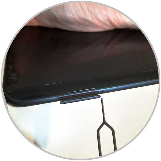 Encontrarás la ranura para la tarjeta SIM en la parte inferior derecha. Para abrirla introduce la llave mencionada anteriormente y la bandeja saldrá fuera.
