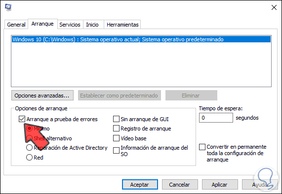 Ejecutar el comando “msconfig”, en la pestaña “Arranque” activamos la casilla “Arranque a prueba de errores”. Damos clic en Aplicar y Aceptar y reiniciamos el sistema para acceder en este modo.