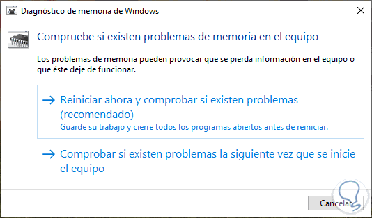 Para usar esta herramienta ingresamos “diagnóstico de memoria” en el cuadro de búsqueda de Inicio y elegimos la utilidad y se desplegará lo siguiente: