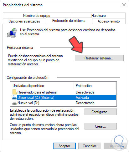 Si optamos por usar un punto de restauración iremos a la Configuración avanzada del sistema e iremos a la pestaña “Protección del sistema”. Damos clic en el botón “Restaurar sistema” para seleccionar algún punto de restauración si existe.
