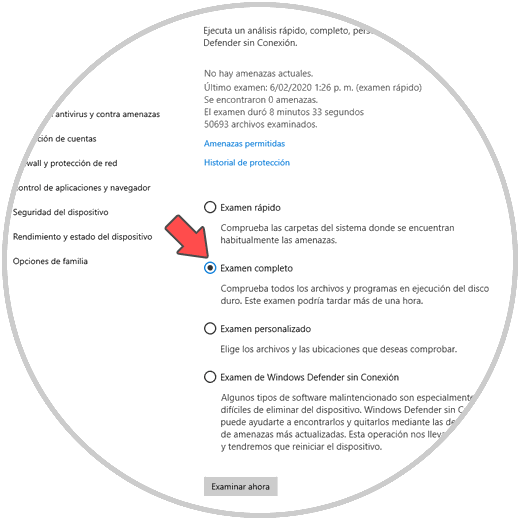 Para esto accedemos a Seguridad de Windows y en la sección “Protección antivirus y contra amenazas” y allí activamos la casilla “Examen completo”: