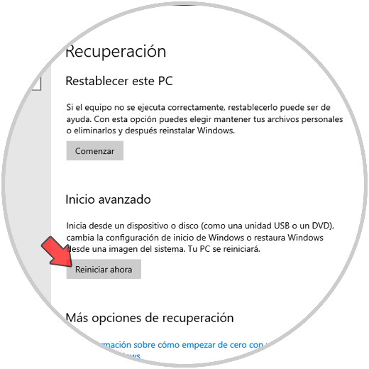 Otra opción es ir a la ruta Inicio / Configuración / Actualización y seguridad / Recuperación y allí dar clic sobre el botón “Reiniciar ahora” ubicado en el campo “Inicio avanzado”: