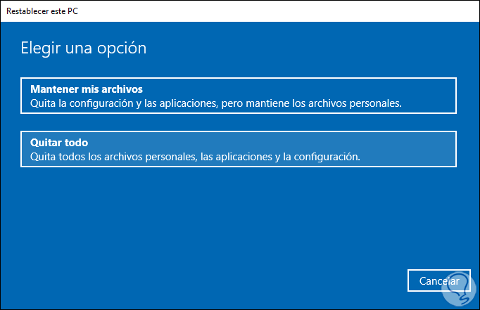Luego de esto podemos definir si conservamos o no nuestros archivos. Esto restablecerá el sistema a sus valores de fábrica con lo cual suponemos una solución al error.