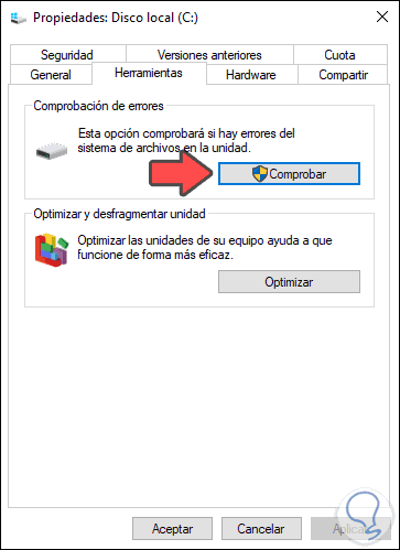 Otra forma posible es dar clic derecho sobre la unidad C y seleccionar “Propiedades”, luego vamos a la pestaña “Herramientas” y damos clic en “Comprobar”: