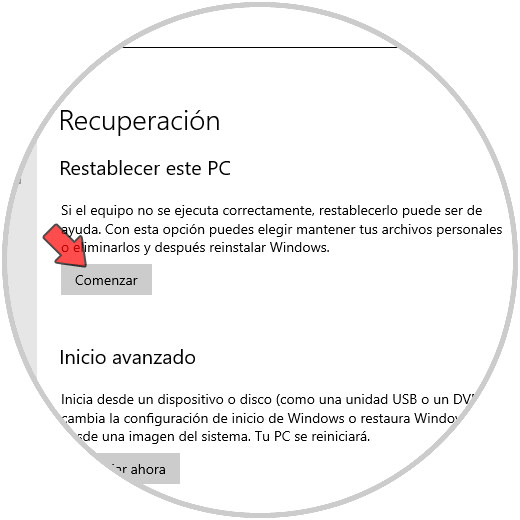 Si optamos por restablecer el sistema iremos a la ruta Inicio / Configuración / Actualización y seguridad / Recuperación y allí damos clic sobre el botón “Comenzar” en el campo “Restablecer este PC”: