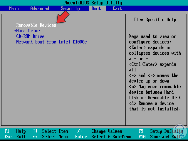 Para este proceso debemos encender o reiniciar el equipo y al acceder al BIOS nos dirigimos a la pestaña Boot donde disponemos de las siguientes opciones. Para el caso del dispositivo USB debemos seleccionar “Removable Device”. En caso de que este en una ubicación inferior, usamos la tecla + para subirla a la primera posición la cual es la que determina el equipo para iniciar el arranque desde allí.