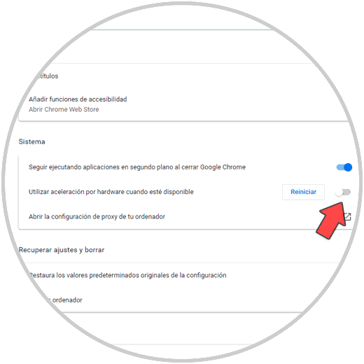 Ahora iremos al apartado de “Configuración avanzada” y buscamos la categoría de “Sistema”. Aquí deshabilitaremos la opción “Utilizar aceleración por hardware cuando esté disponible” y reiniciaremos el navegador.