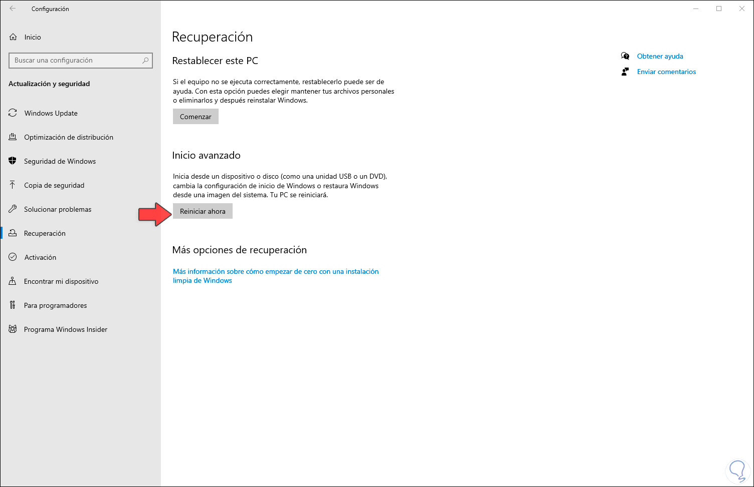 Allí vamos a la sección “Recuperación” y damos clic en el botón “Reiniciar ahora” ubicado en el campo “Inicio avanzado”: