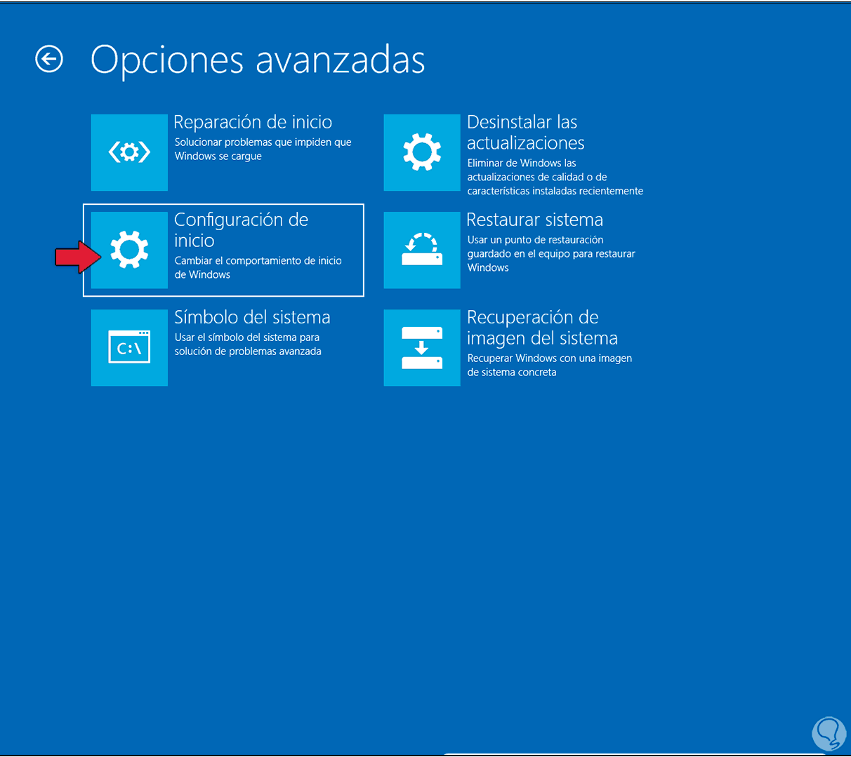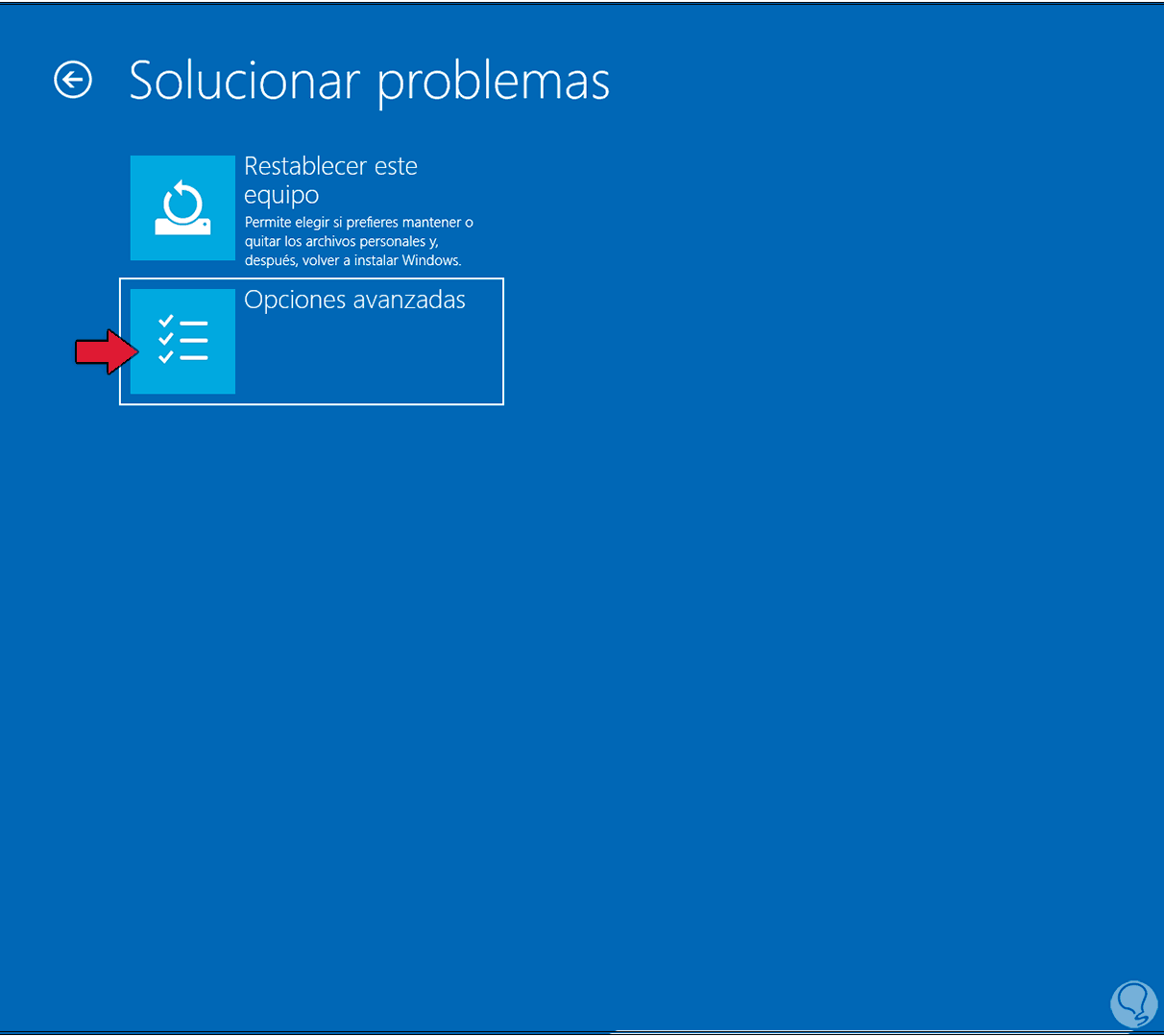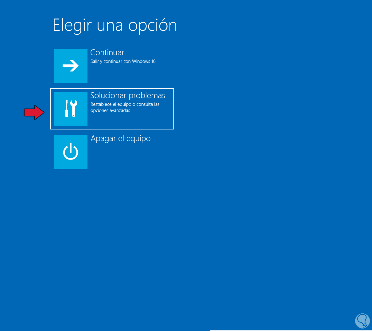 El sistema será reiniciado y veremos lo siguiente. Seleccionamos la opción “Solucionar problemas” y luego estarán las siguientes posibilidades: