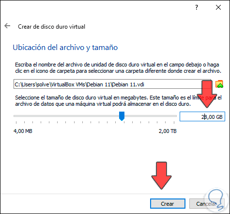 En la siguiente ventana definimos dónde se guardará el disco duro virtual, así como el tamaño del mismo:
