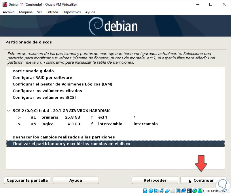 Allí seleccionamos “Finalizar el particionado y escribir los cambios en el disco” y al pulsar Continuar debemos confirmar esto: