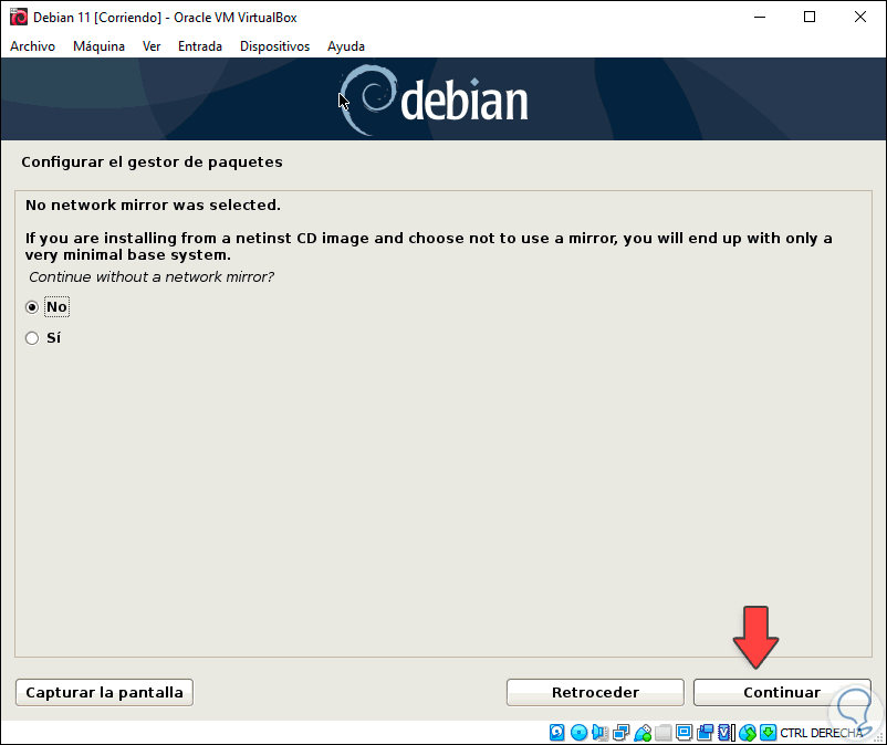 Luego veremos la siguiente ventana donde podemos seleccionar desde donde se usará la réplica de Debian 11 o bien podemos no usar este método: