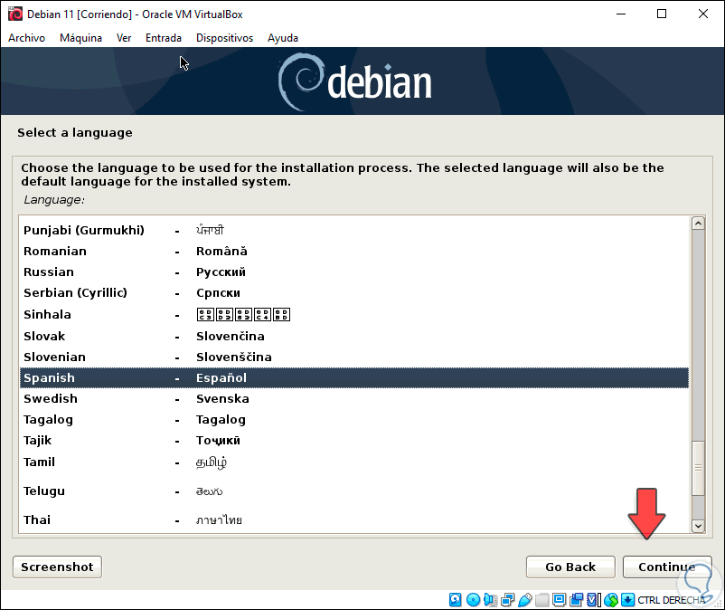 Seleccionamos “Graphic install” y en primer lugar definimos el idioma de instalación de Debian 11:
