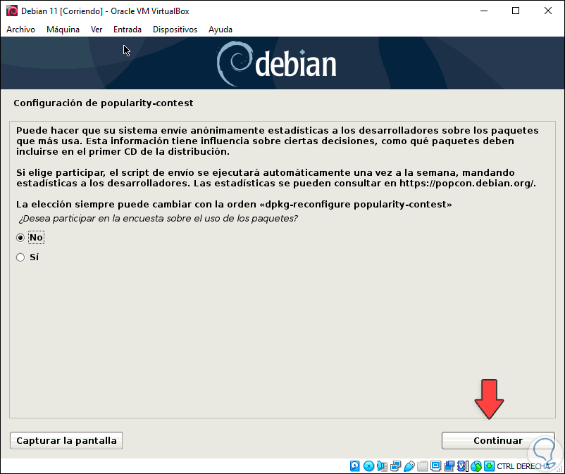 Luego instalará el software a usar en Debian 11, se desplegará lo siguiente acerca de las encuestas de paquetes: