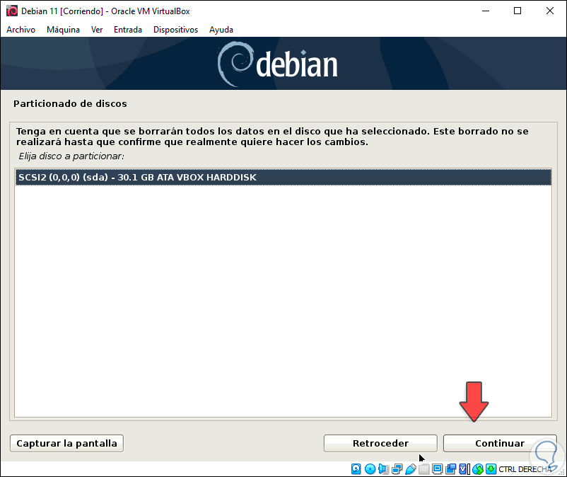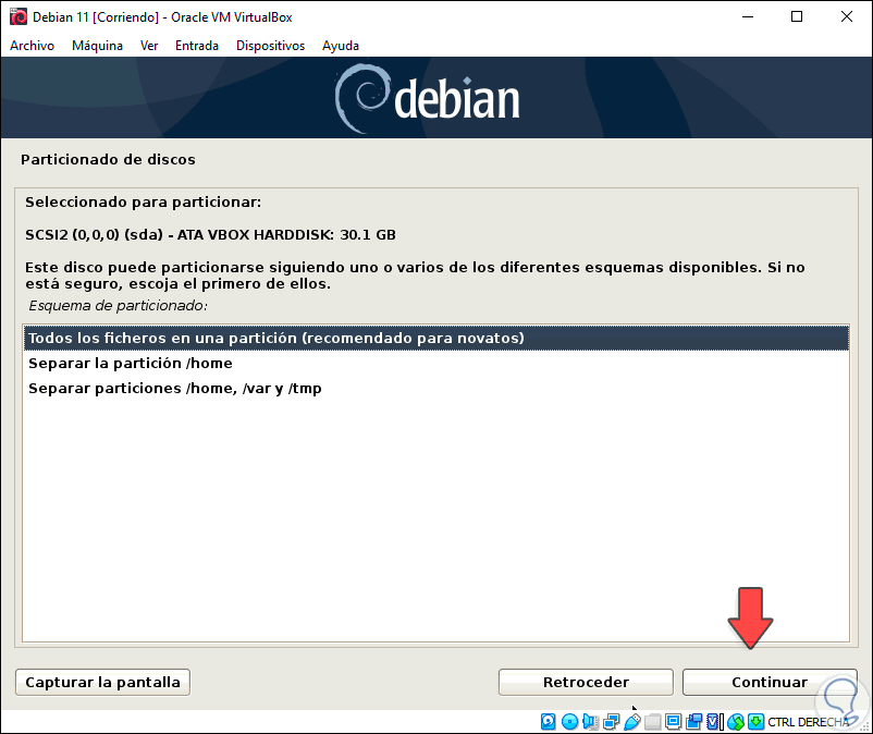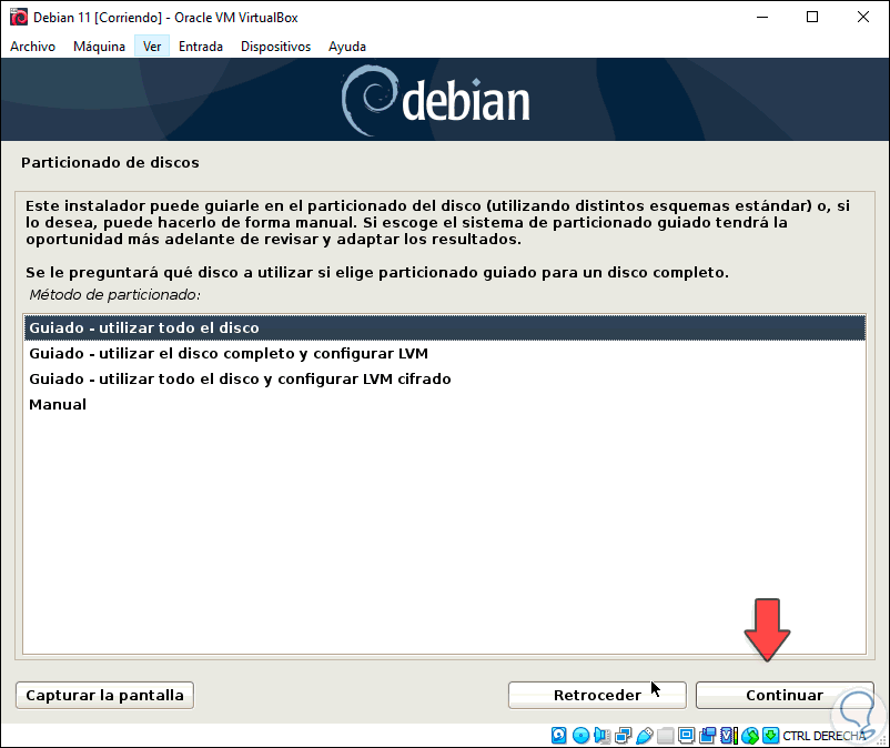 Seleccionamos la opción por defecto y elegimos el disco donde se instalará Debian 11: