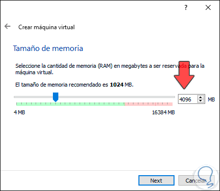 Damos clic en Next y asignaremos la memoria RAM a usar: