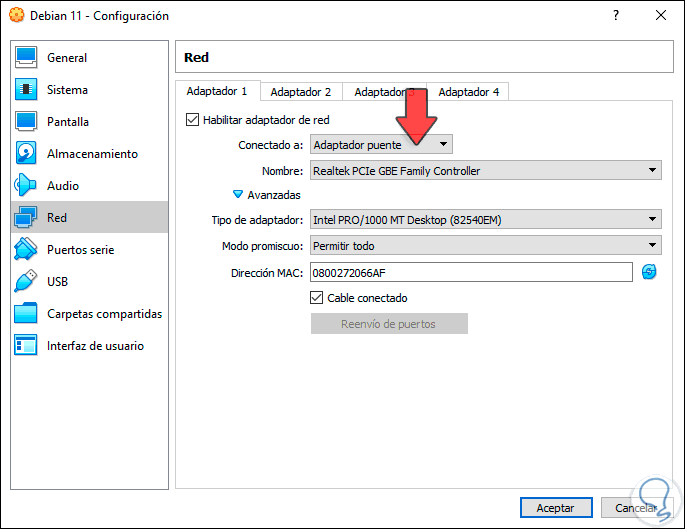 Allí damos clic en el botón “Configuración” para realizar algunos ajustes siendo el más importante en la sección “Red” para elegir “Adaptador puente” con el fin de que la máquina virtual tenga acceso a la red: