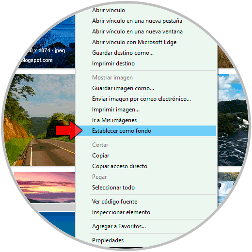 Para esto accedemos a Internet Explorer, buscamos alguna imagen y sobre la imagen que nos gusta damos clic derecho y en el listado desplegado seleccionamos la opción “Establecer como fondo”: