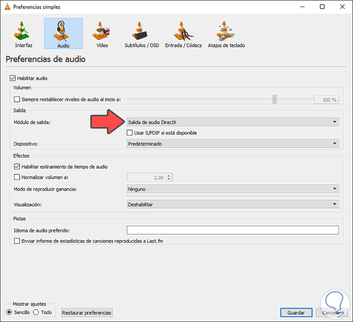 - En el campo “Módulo de salida” establecemos el valor “Salida de audio DirectX”